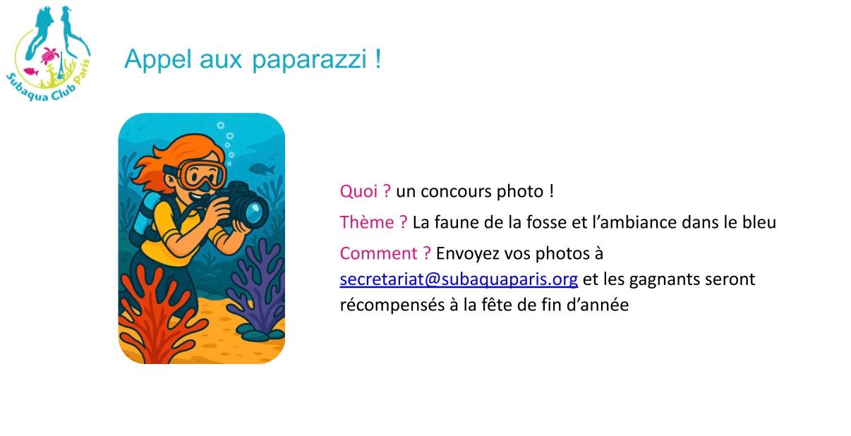 N’hésitez pas à y participer en envoyant votre plus beau cliché sur le thème “La faune de la fosse” et “l’ambiance dans le bleu” par mail à secretariat@subaquaparis.org